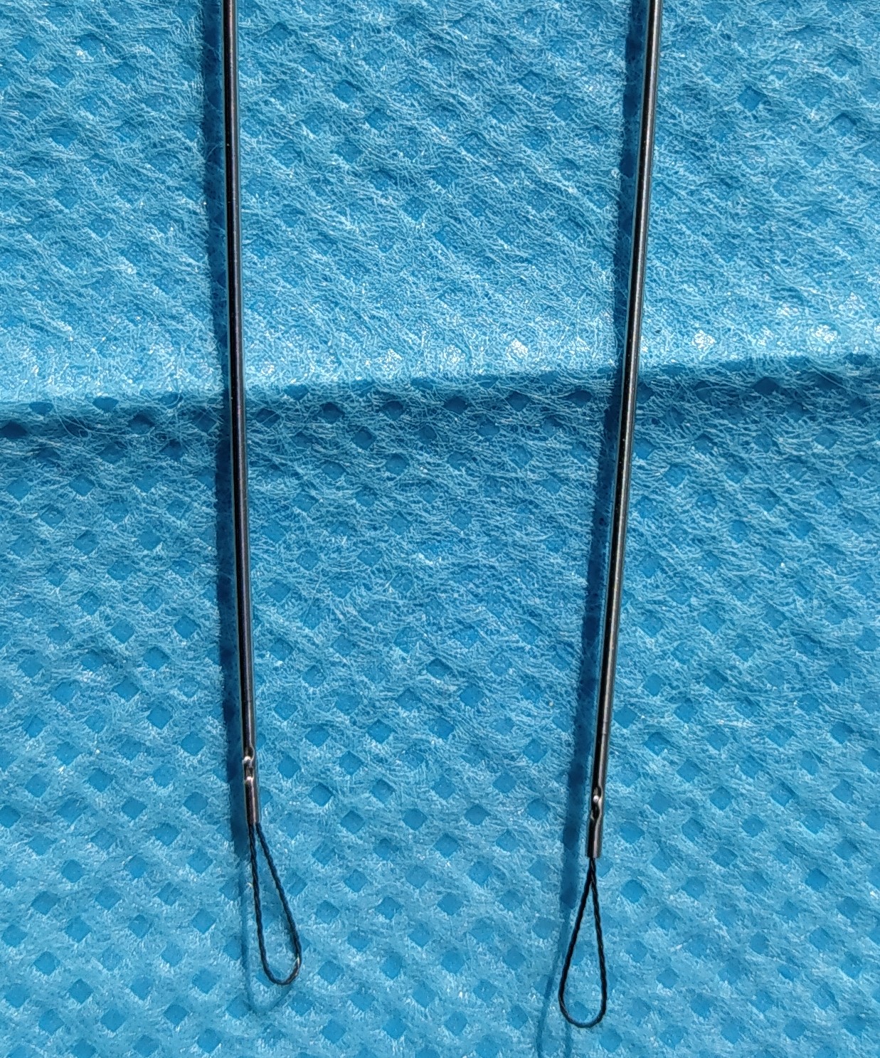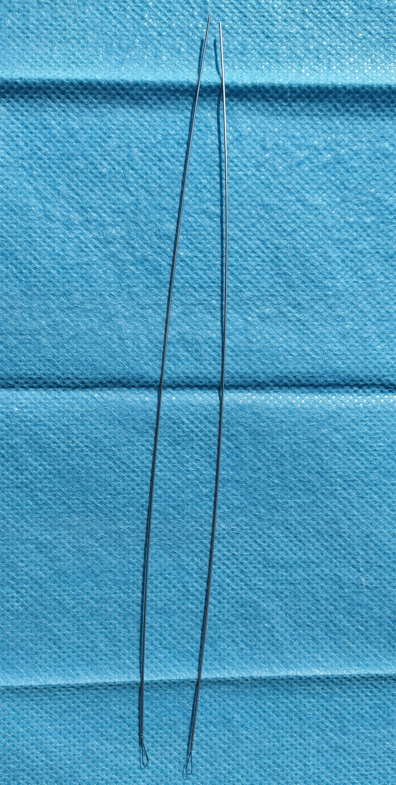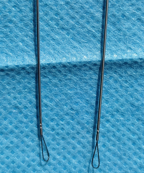 Nagyon vékony fém áthúzódrót, a végén hurokkal, mellyel a szalagpótló anyagot tudjuk az előre megfúrt lyukon áthúzni. A termék teljes hossza 210 mm.
